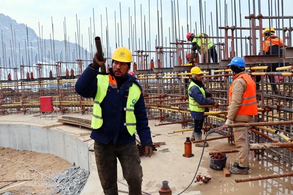 巍巍雪山下,廣闊原野上,地處中亞腹地的烏茲別克斯坦塔什干海螺項目施工現(xiàn)場,塔吊林立,機器轟鳴,近900名工人正熱火朝天地奮戰(zhàn)在施工一線。項目主體工程多數(shù)框架已交安,設備物資到貨3萬方,回轉窯托輪吊裝就位,煤立磨完成主體安裝,宿舍樓結構封頂,主廠區(qū)初見雛形。